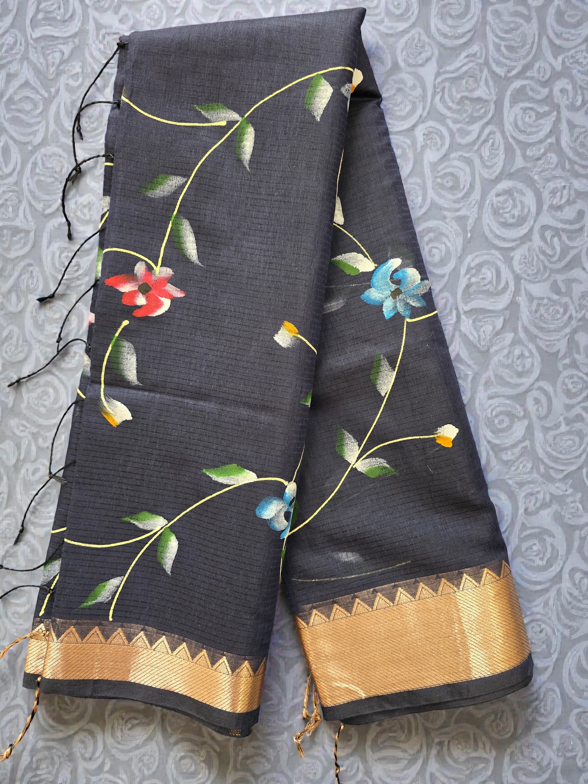 Beautiful Black Handpainted saree adorned with intricate floral motifs igiving it a refined and stylish appeal.