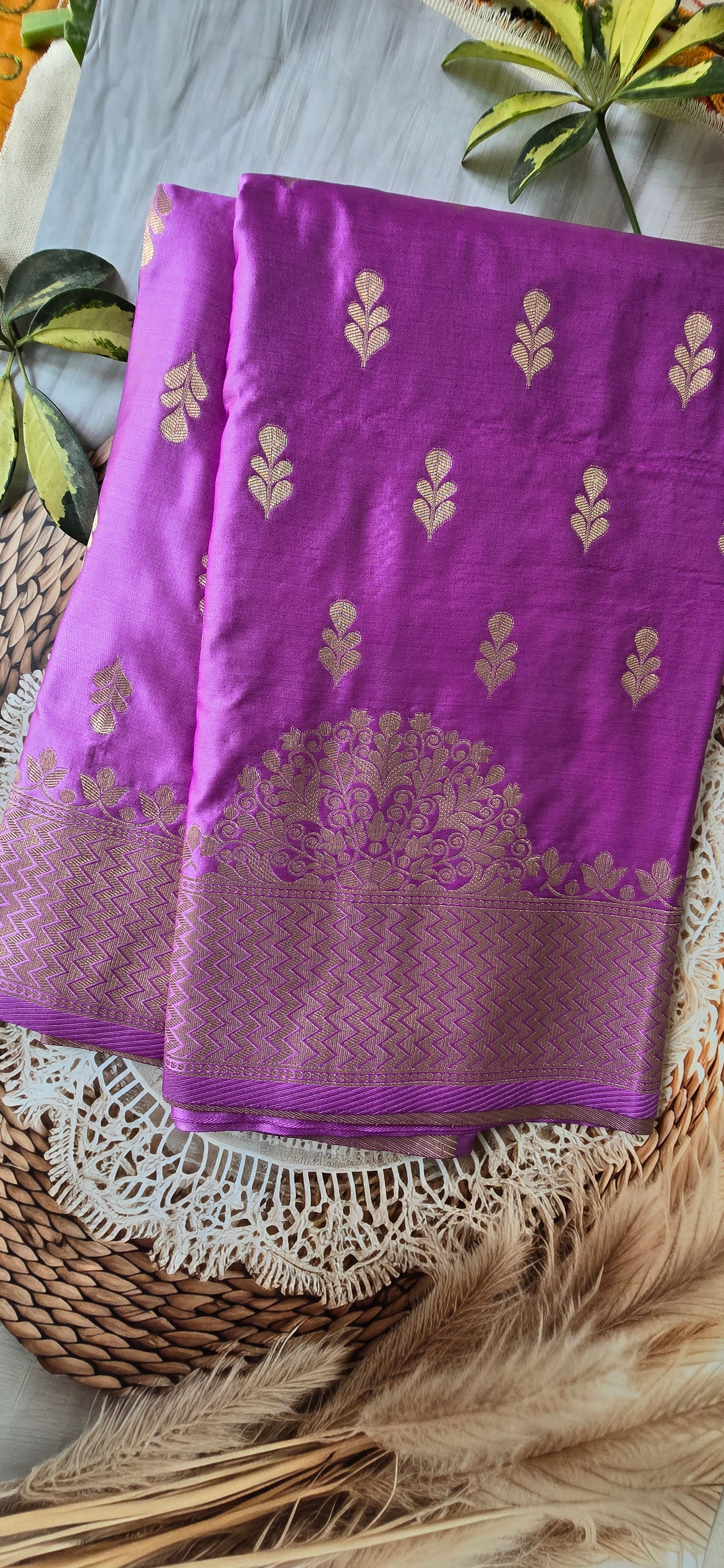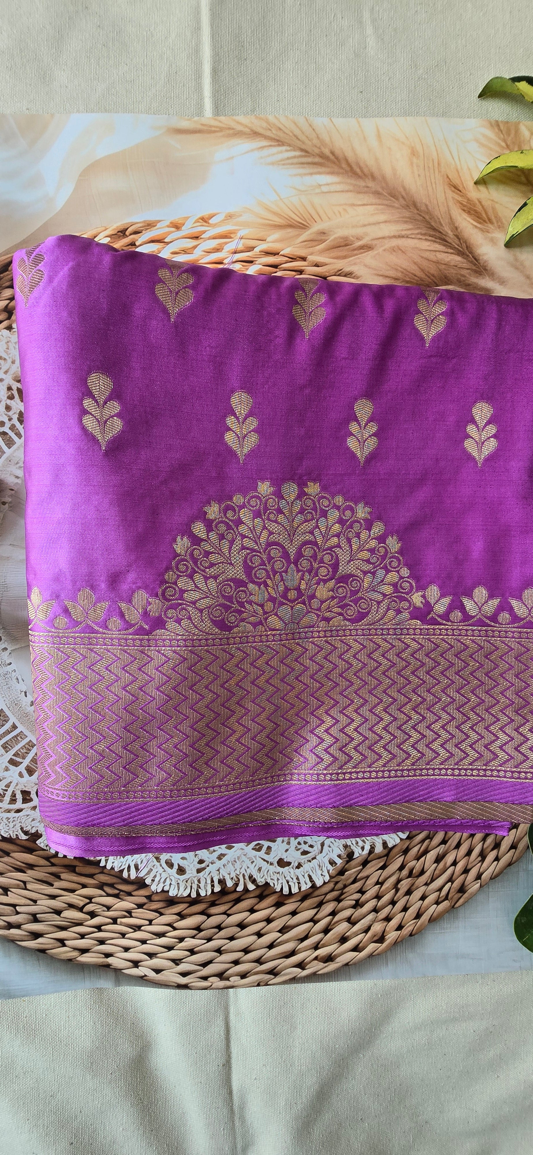 Beautiful Lavender Mashru Katan saree adorned with intricate floral motifs in golden thread, giving it a refined and stylish appeal.