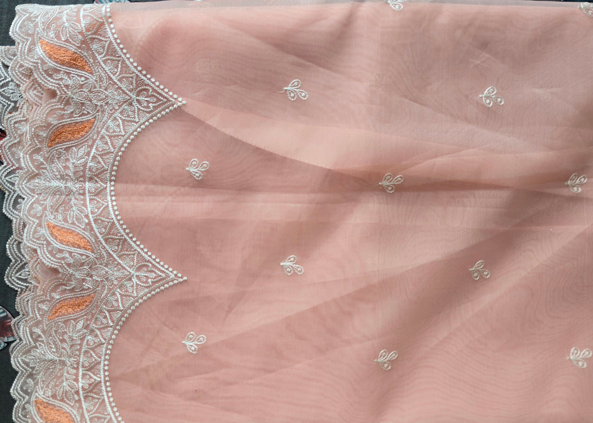 Pink Banarsi tissue embroidered saree with scalloped border. The saree has beautiful white embroidery in the border giving it a very graceful look.