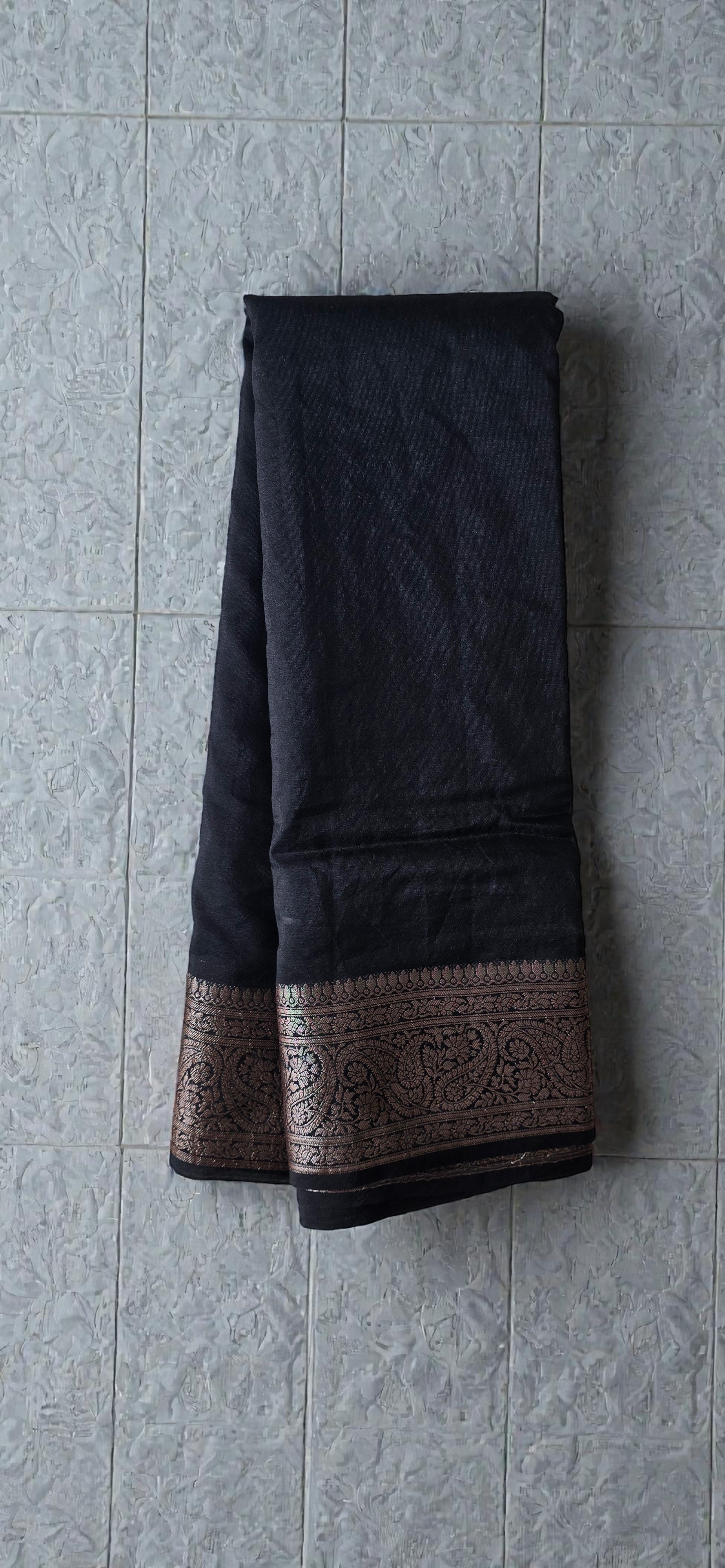Graceful , Black Banarsi Crepe Silk Saree with Copper zari work on pallu. The saree has blouse in contrast red colour giving it a refined and timeless appeal.
